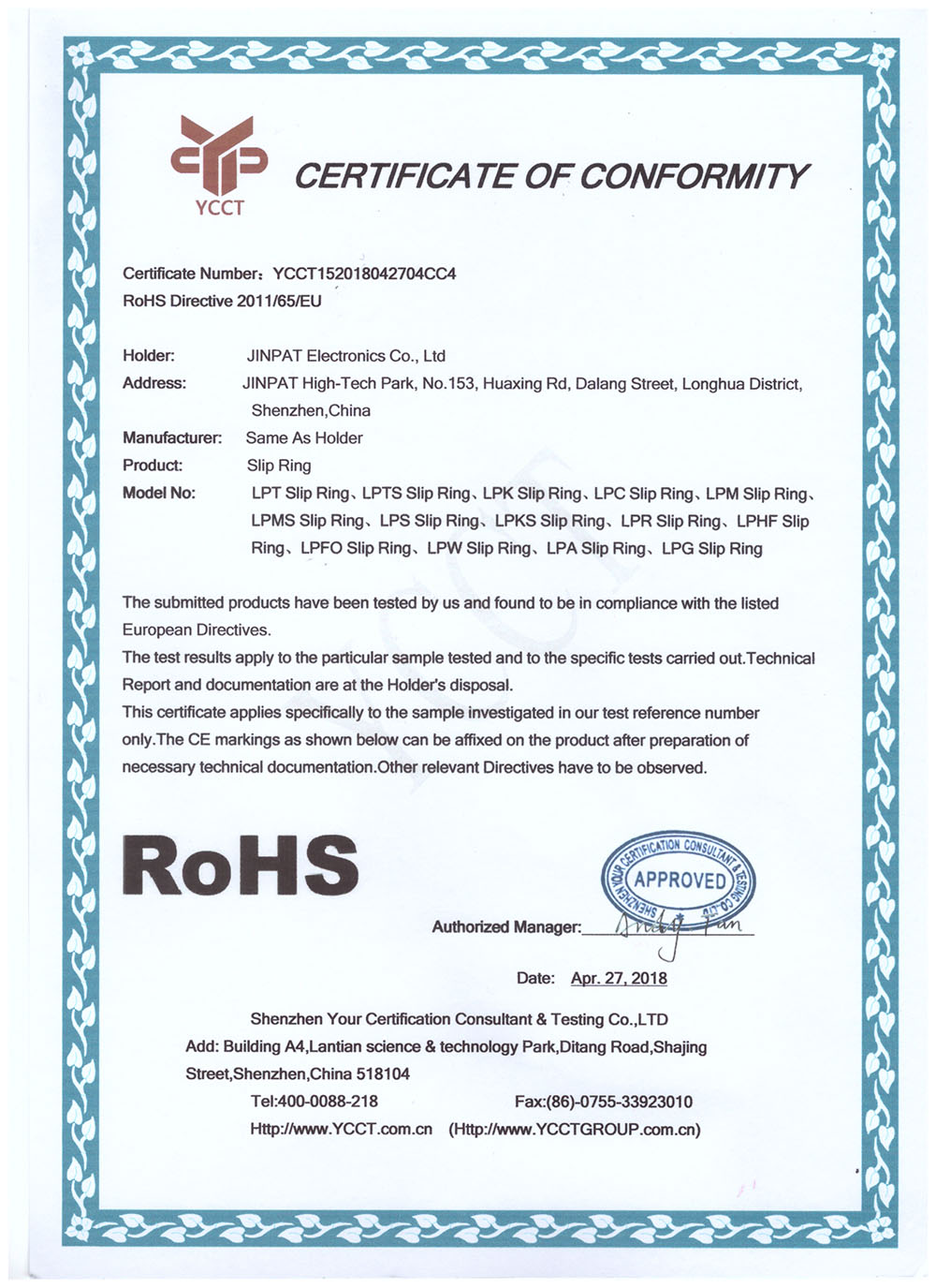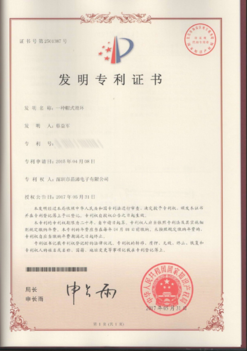 晶沛通過(guò)了歐盟CE認(rèn)證暗送秋波、FCC認(rèn)證堂堂正正、SGS認(rèn)證眼观六路耳听八方、BV“船級(jí)社”認(rèn)證、防爆認(rèn)證等多項(xiàng)認(rèn)證,生產(chǎn)的導(dǎo)電滑環(huán)都符合RoHS環(huán)保要求,先后被授予“國(guó)家高新技術(shù)企業(yè)”稱(chēng)號(hào),目前已獲得45項(xiàng)專(zhuān)利,其中發(fā)明專(zhuān)利6項(xiàng)。